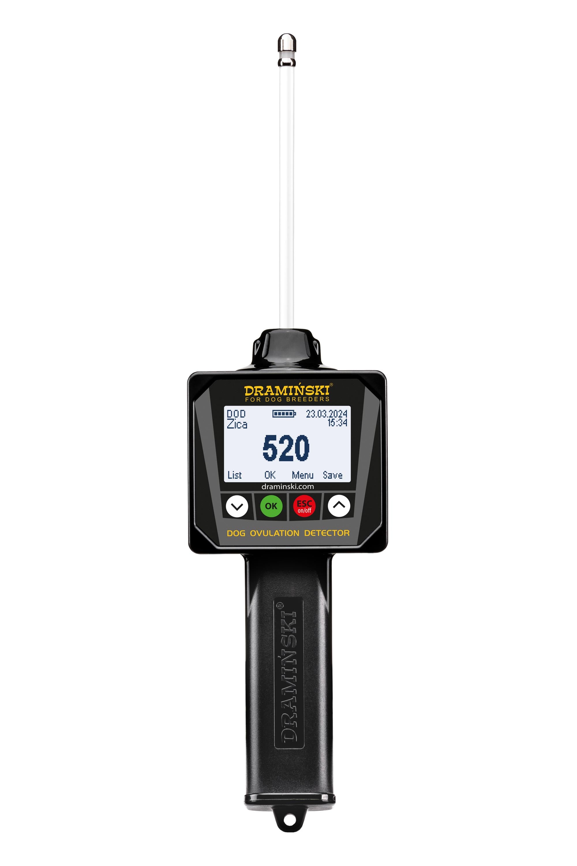 The DRAMINSKI Dog Ovulation Detector is a perfect device for breeders who experience problems with productive matings. Due to this simple method, breeders can detect ovarian cycle disorders. Therefore, determining the best date of mating, even if external symptoms fail to indicate otherwise. The DRAMINSKI Dog Ovulation Detector uses the relationship between changes in the electrical resistance of mucus and the appearance of oestrous. Measurement is easy to make and completely safe for the tested animal.